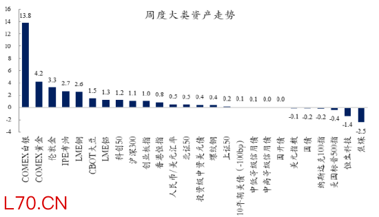 过去一周,全球资产呈现“商品强、股债弱、风格偏周期”的格局。大宗商品领涨,COMEX白银周涨13.8%,伦敦金、ICE布油、LME铜等大宗商品同步走高,凸显避险与通胀预期;A股宽基小幅上行,科创50、沪深300涨超1%,A股行业端,有色金属、基础化工等周期板块领涨,传媒、非银金融则跌幅居前。