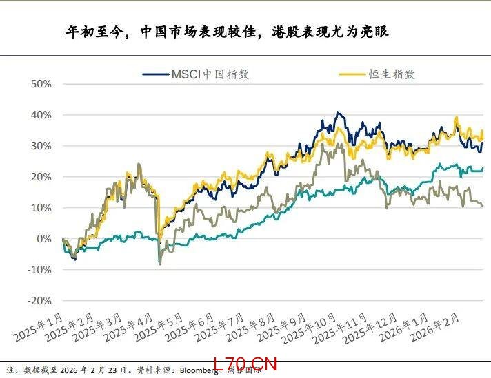 从仓位的配置上来看,尽管目前全球投资人对中国股票市场的风险敞口仍然处在低配的水平,更多是一些结构上的调整,但未来增配的潜力很大。在国际地缘政治动荡的背景下,中国资产的韧性会持续凸显。今年开年以来,前期亚太市场和新兴市场受益于存储和芯片的超级周期大幅上涨,相对而言,目前中国市场估值合理,有更好的增长潜力。