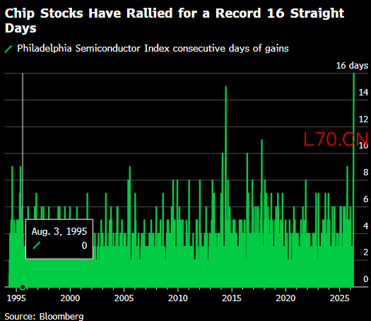 一项追踪半导体股票的指数有望创下有史以来最长的日连涨纪录,因投资者押注人工智能相关需求将推动该行业实现强劲增长。