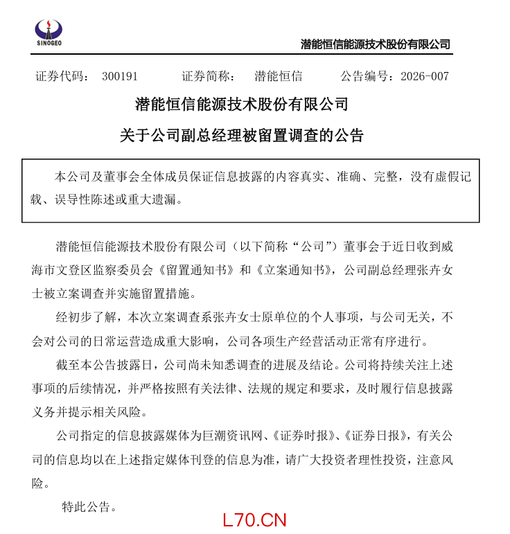 3月19日晚间,潜能恒信(300191)公告称,董事会于近日收到威海市文登区监察委员会《留置通知书》和《立案通知书》,公司副总经理张卉女士被立案调查并实施留置措施。