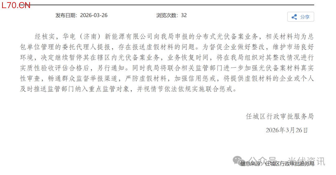 ]article_adlist-->通知表示,华电(济南)新能源有限公司向我局申报的分布式光伏备案业务,相关材料均为总包单位管理的委托代理人提报,存在报送虚假材料的问题。为督促企业做好整改,维护市场良好环境,决定继续暂停其在辖区内光伏备案业务,业务恢复时间,将在我局组织对其整改情况进行实质性验收评估合格后,另行通知。