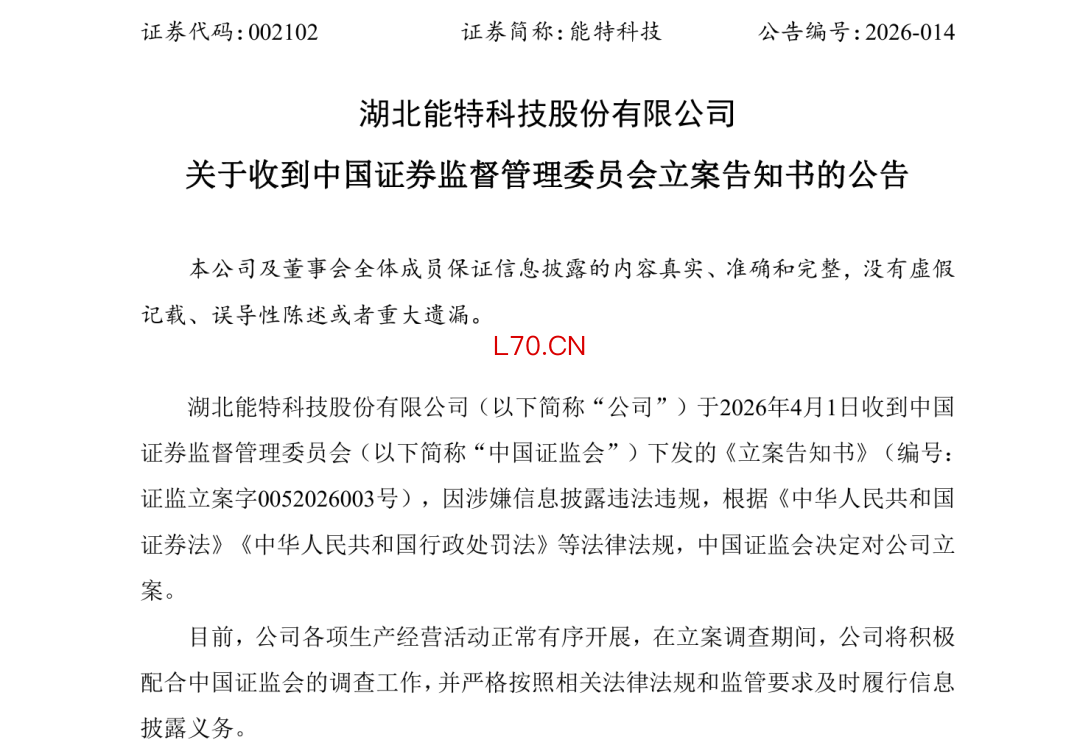 能特科技公告,目前,公司各项生产经营活动正常有序开展,在立案调查期间,公司将积极配合中国证监会的调查工作,并严格按照相关法律法规和监管要求及时履行信息披露义务。