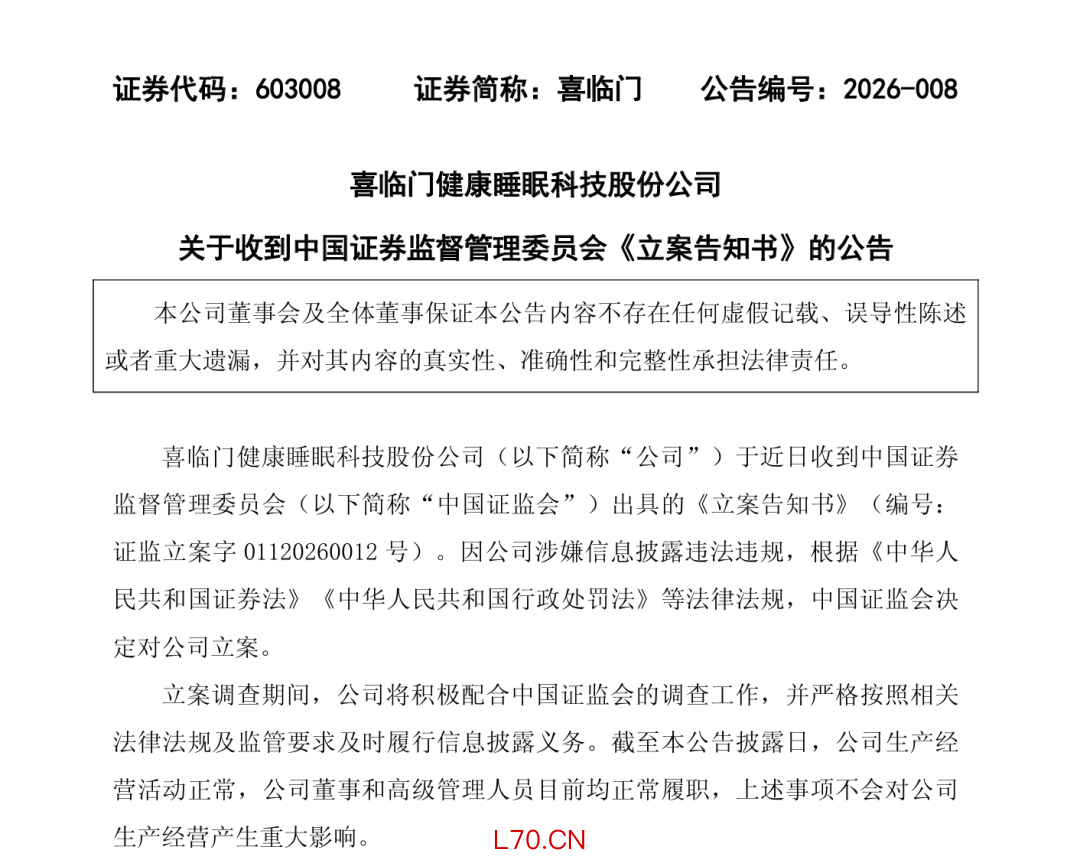 同在4月1日晚间,喜临门发布公告称,公司于近日收到中国证监会出具的《立案告知书》,因公司涉嫌信息披露违法违规,中国证监会决定对公司立案。立案调查期间,公司将积极配合调查工作,并严格履行信息披露义务。截至公告披露日,公司生产经营活动正常,董事和高级管理人员均正常履职,上述事项不会对公司生产经营产生重大影响。