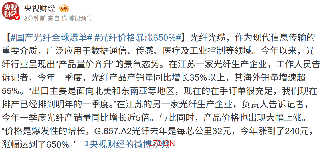 国产光纤全球爆单 部分产品价格暴涨650%国产光纤全球爆单 部分产品价格暴涨650%