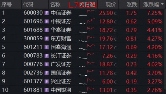 个股集体走强,中证全指证券公司指数囊括的49只成份股涨幅中位数达2.11%。龙头券商携手猛攻,“券业一哥”中信证券绩后高调领涨,涨幅一度超9%;华泰证券、东方财富、国泰海通、广发证券等涨幅居前。