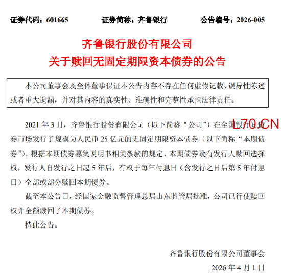 4月1日金融一线消息,齐鲁银行发布公告称,2021年3月,公司在全国银行间债券市场发行了规模为人民币25亿元的无固定期限资本债券(以下简称“本期债券”)。根据本期债券募集说明书相关条款的规定,本期债券设有发行人赎回选择权,发行人自发行之日起5年后,有权于每年付息日(含发行之日后第5年付息日)全部或部分赎回本期债券。